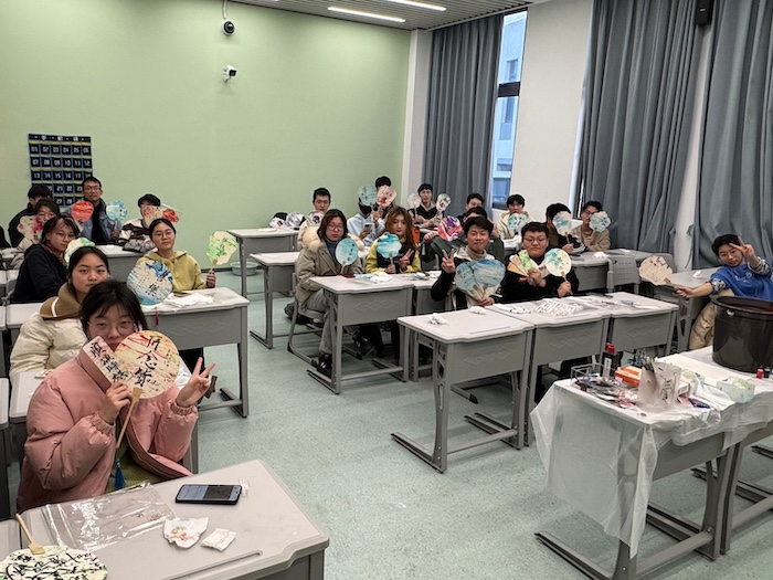 漆扇传非遗,文化润心田。在新校区的教室里,一场充满创意与文化韵味的漆扇手工课精彩开场。同学们学习漂漆技法,利用大漆不溶于水的独特性质,将缤纷彩漆轻轻滴入水中,彩漆在水面晕染、流动,形成奇妙的纹理。随后,大家手持空白团扇缓缓浸入水中,通过巧妙的旋转、抖动,漆色均匀地附着在扇面上,绘就出一幅幅精美的图案。完成的漆扇各具特色,有的扇面似泼墨山水,大气磅礴;有的如敦煌壁画,神秘瑰丽,尽显东方美学的独特韵味。在沉浸式的创作体验中,大家领略到“漆水交融”带来的随机美感。此次活动制作漆扇50余把,部分作品将捐赠给社区孤寡老人,让传统文化与温暖关怀一同传递。