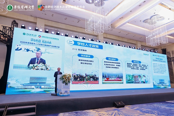 3月22日,2025年青年医学人才安徽行暨健康产业创新大会在合肥召开。安徽省外办党组成员、副主任杨小琳,省生命健康产业专班办公室主任徐雪晖出席会议,校党委书记王琦为参会嘉宾颁发科研合作友谊奖,校长翁建平致欢迎辞并作校情和人才政策宣讲,校党委副书记徐朝阳主持会议,副校长洪静芳出席会议。会前,与会校领导会见了出席活动的领导嘉宾。