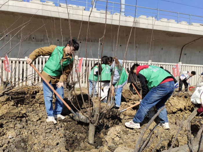 在新站高新区龙子湖路,一场义务植树活动如火如荼展开。学院学生热情高涨,有序领取工具并迅速投入到植树行动当中,分工协作,配合默契。有的挥锹铲土,挖掘树坑;有的扶正树苗,浇水灌溉,每一个步骤都有条不紊。经过大家齐心协力,一株株树苗在少荃湖畔“拔地而起”。“看着亲手栽种的树苗扎根生长,为城市增添了一抹亮丽的风景,幸福的感觉溢于言表。”2022级生物科学专业胡本飞植树结束以后感慨道。