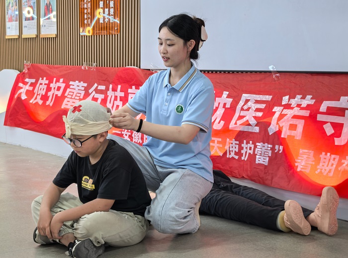 实践课堂做好“生命守护”。实践团发挥医学生的专业优势,将理论知识与现场实操相结合,科普了心肺复苏、海姆利克急救法和伤口包扎等实用技能,并进行急救示范。队员们协助指导孩子们在模拟假人上练习“叫叫压吹”的步骤,并互相扮演“小伤员”学习包扎技巧。课堂气氛热烈,当地儿童不仅掌握了急救知识,还培养了团队合作和互助友爱的精神。