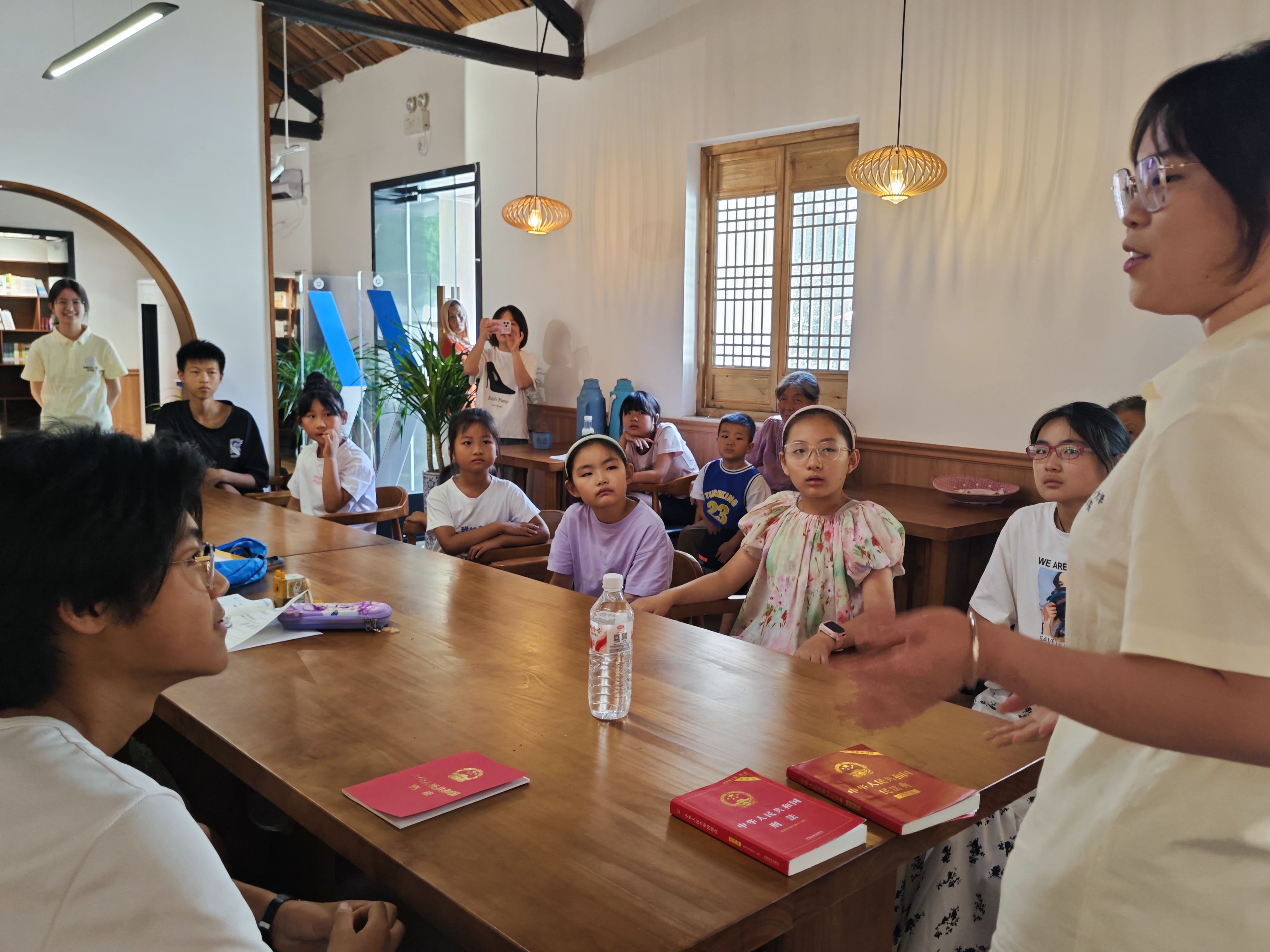 法治启蒙进书屋,安全护航伴童行。在八公山豆腐村书房,实践团成员和孩子们围坐在农家书屋中,一场别开生面的“法治启蒙课堂”由此展开。“法律像不像我们生活中的‘超级英雄’?”“法律会保护我们和家人的安全,也会保障我们安心上学、快乐成长的权利哦!”小朋友们在“谁来保护我的名字”“坏事的红线在哪里”等答题互动中踊跃发言,争当“法律小达人”。队员们还讲解了防溺水安全知识与防电信诈骗实用技巧,传授“识骗局、防危险、会求助”的基本方法。