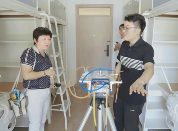 在学生及家长代表现场观摩中,学校邀请安徽省产品质量监督检验研究院研究人员在宿舍进行空气检测,检测结果显示各项指标均完全符合国家安全标准,家长们纷纷表示欣慰。一位家长代表的话语道出了大家的心声:“学校考虑得太周到了,安全检测让我们彻底放下了对住宿环境的顾虑。孩子住得舒心,我们一百个放心。”学生代表也表示,新校区的设施与环境远超预期,对即将在这里开启的学习生活充满向往。